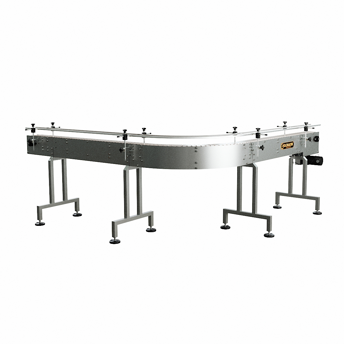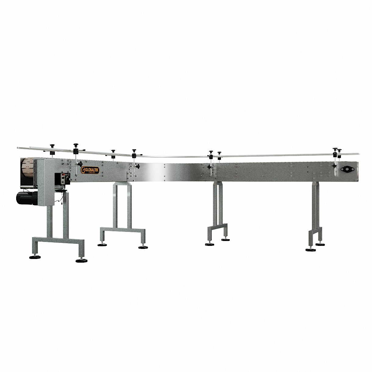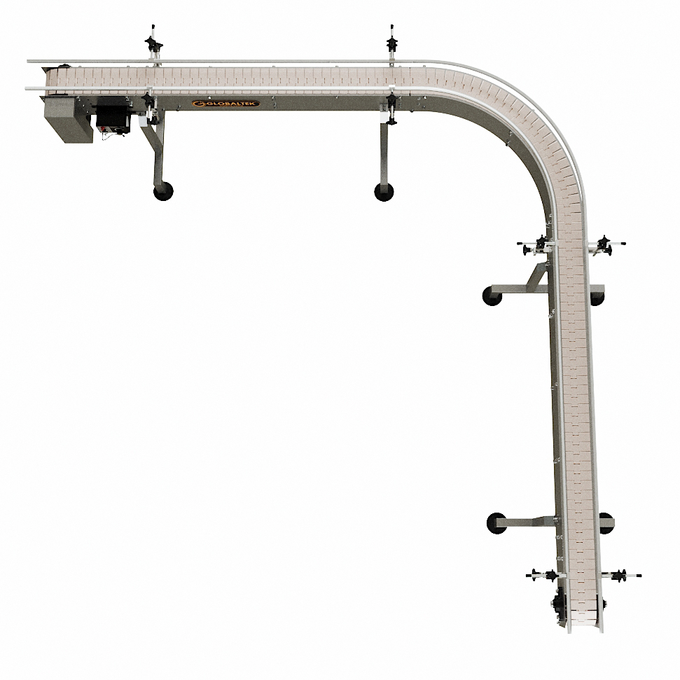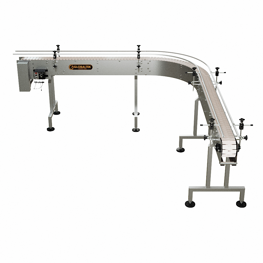 The GlobalTek® Stainless Steel 90 Degrees L-Shape and 180 Degrees U-Shaped Conveyor Line System features a Made in USA Bodine motor and variable speed control. This conveyor is ideal to maximize space in a production line and adjust to corners. They are used for perpendicular product transfers without disturbing the flow and orientation.