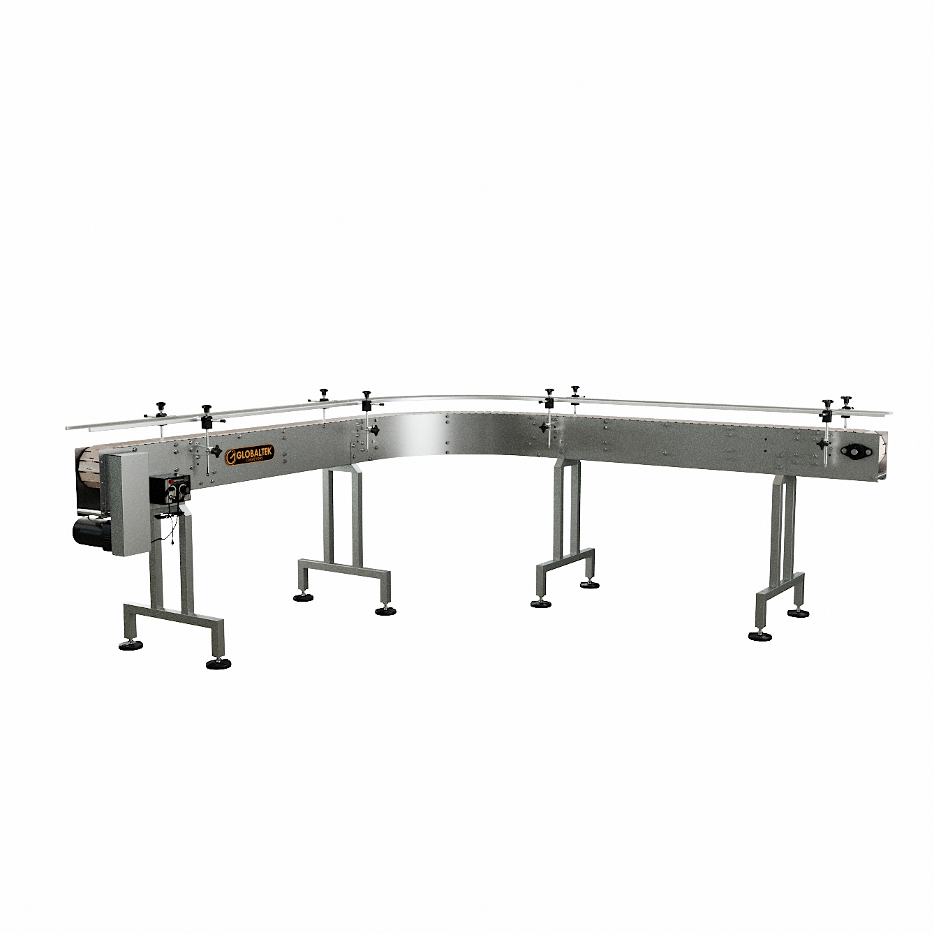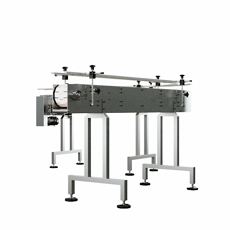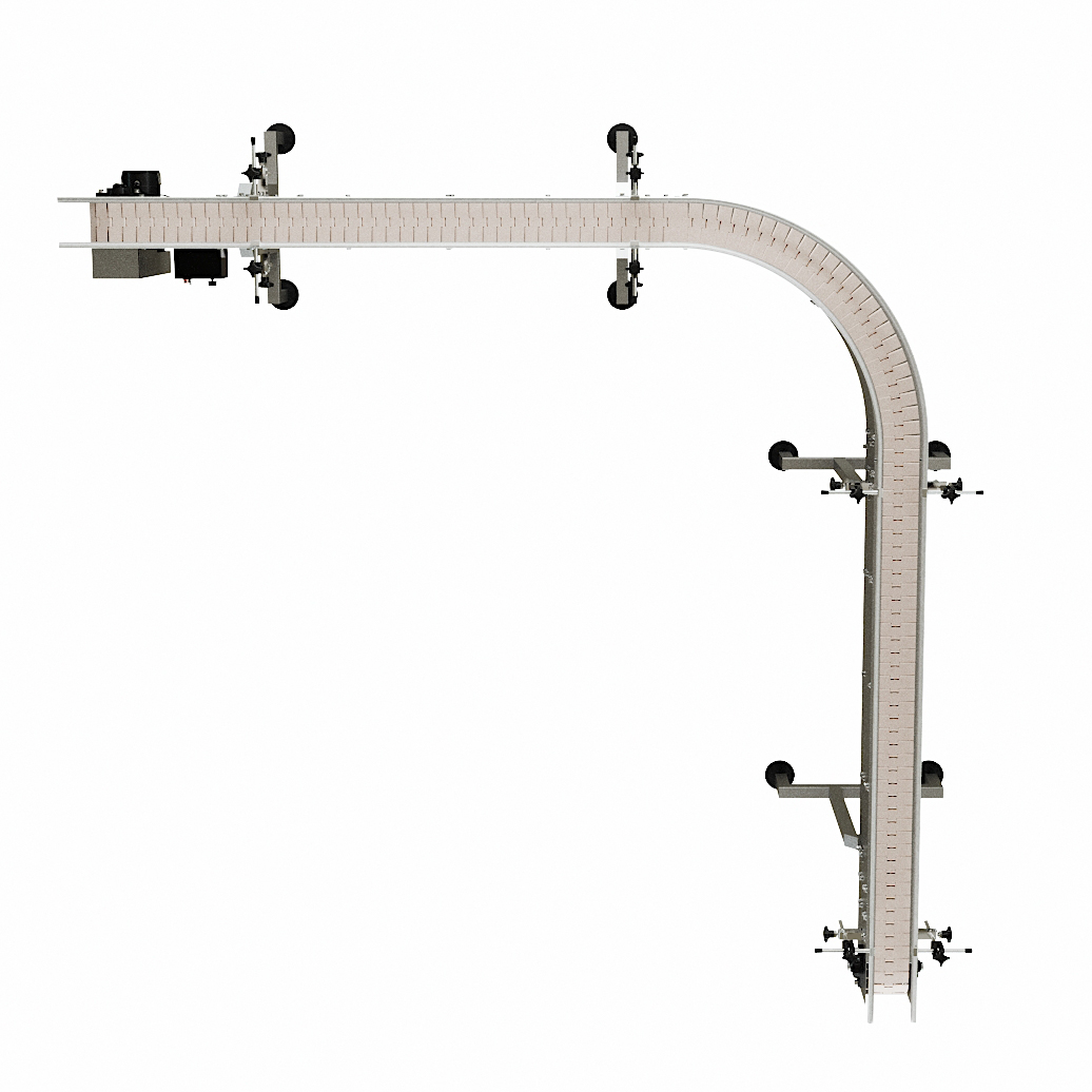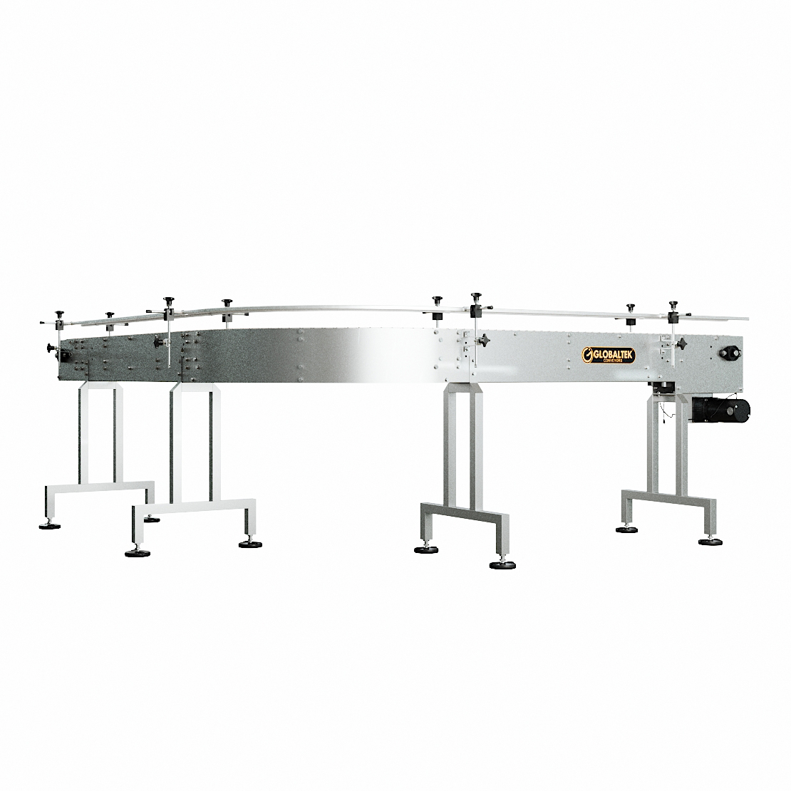 The GlobalTek® Stainless Steel 90 Degrees L-Shape and 180 Degrees U-Shaped Conveyor Line System features a Made in USA Bodine motor and variable speed control. This conveyor is ideal to maximize space in a production line and adjust to corners. They are used for perpendicular product transfers without disturbing the flow and orientation.